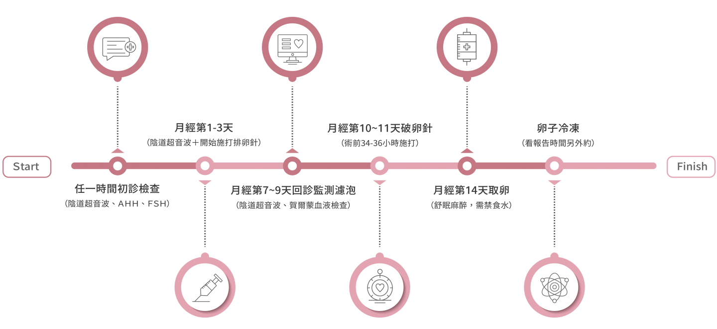 了解到自身狀況後,則可以開始評估是否進入凍卵療程,凍卵療程簡單來說會分六大階段(如下圖)