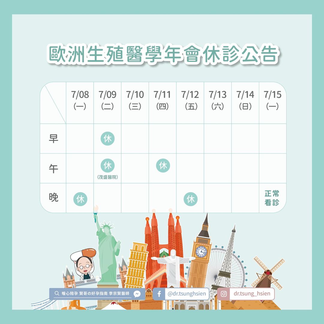 感覺才剛參加完美國生殖醫學,轉眼又到了歐洲生殖醫學年會 相信這次也會收穫滿滿,期待再與大家分享這次的行程 由於行程時間比較長,因此下週停診時間如圖,7/15就正常看診嘍! #今日出發 #下週停診 #歐洲跟台灣的時差大約是6小時 #有問題可以直撥生殖中心或者私訊我都沒問題
