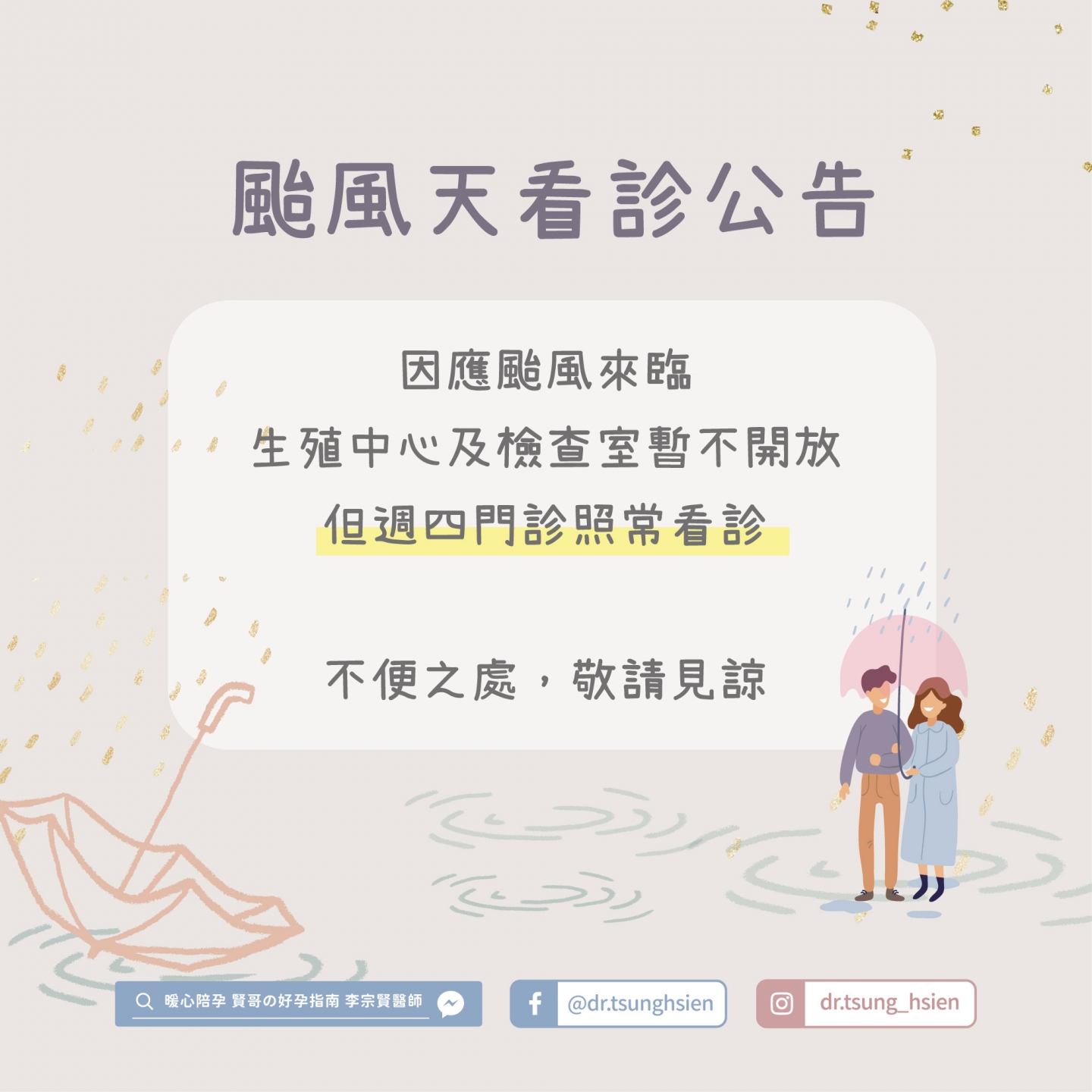 因應凱米颱風來臨,7/25生殖中心及檢查站不開放 但門診正常看診 若有看診需求可於報到時間截止前前來 *掛號注意事項 >> https://reurl.cc/VzGdk6 *私訊粉專連結 >> https://reurl.cc/r9z7ME