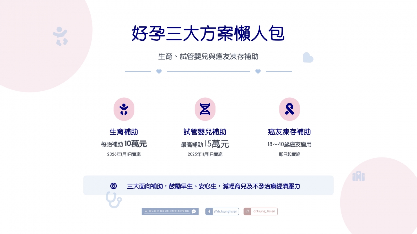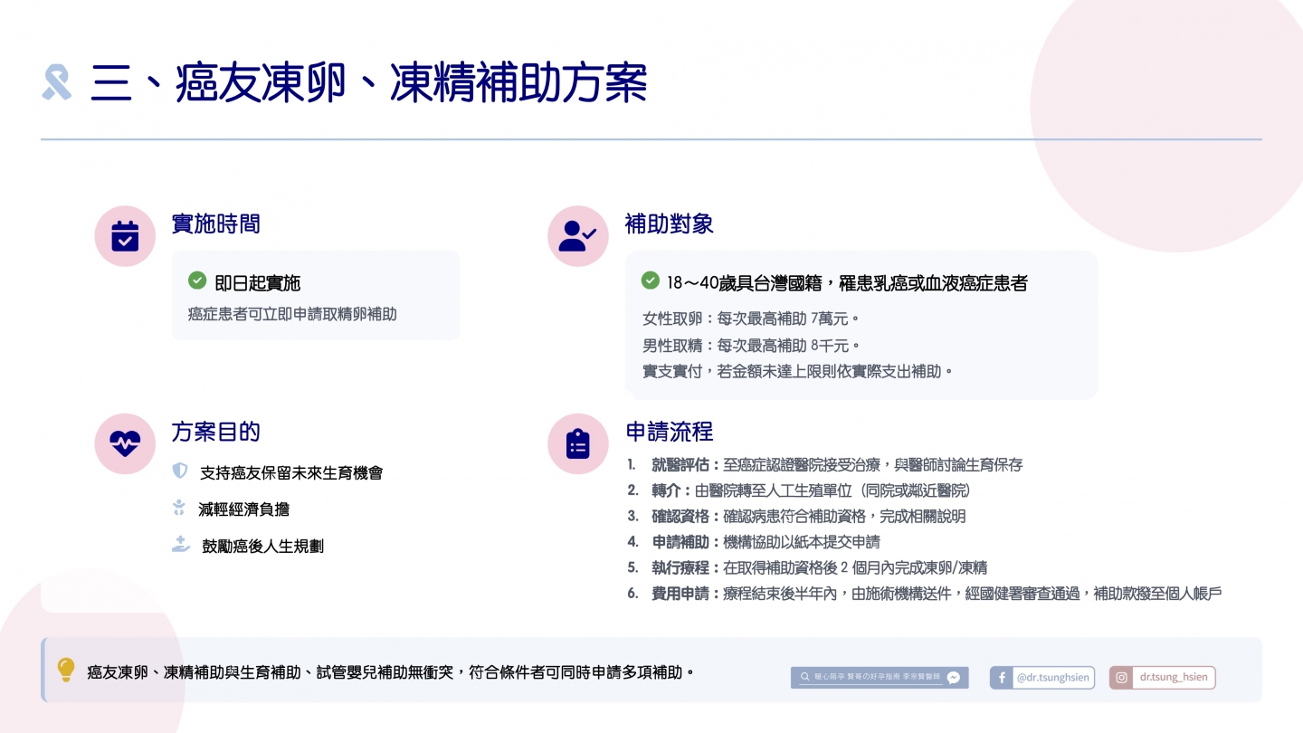 值得注意的是,癌友凍卵、凍精補助與生育補助、試管嬰兒補助並不衝突,符合資格者可同時申請,讓整體支持更完善