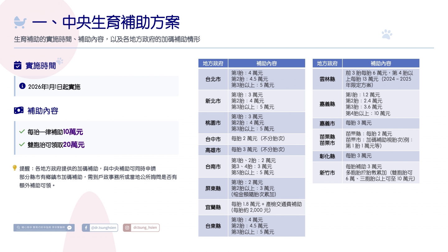 每胎補助10萬元,雙胞胎可領20萬 自 2026年1月1日起,政府正式實施全國性的生育補助政策,每胎補助10萬元,雙胞胎則可領取 20萬元。 除此之外,民眾還可同時申請各縣市政府的地方加碼補助